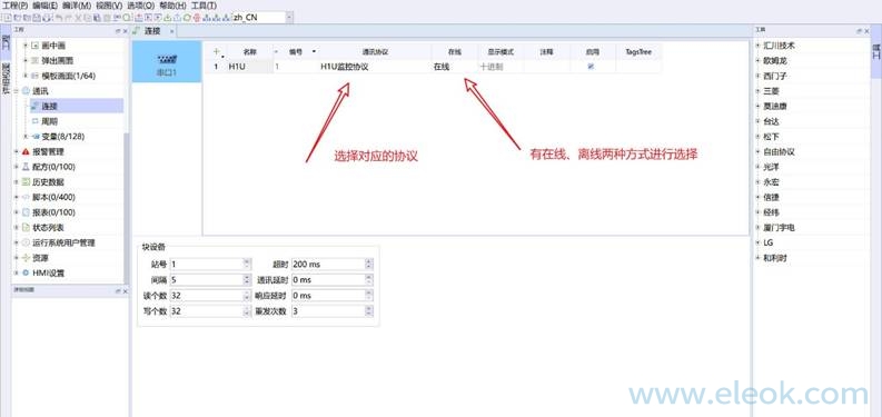 IT7000和HIU-XP是通过串口连接,走的485通信协议,不能用以太网通信。在InoTouchPad中添加IT7000和HIU-XP的串口连接方式,如下图所示: