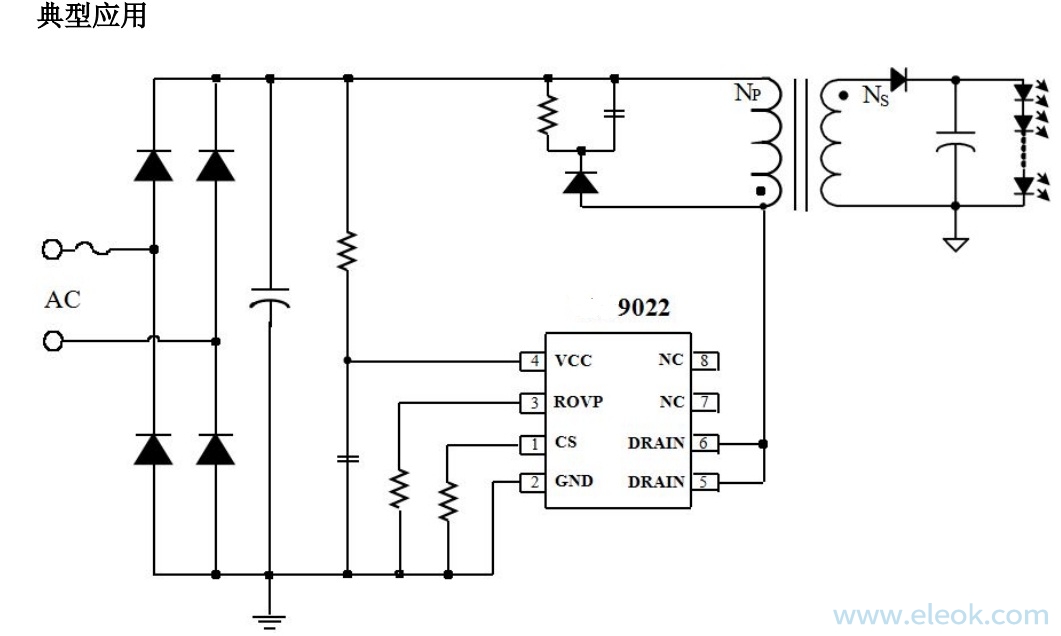 芯片内带有高精度的电流采样电路, 同时采用了恒流控制技术, 可实现高精度的LED恒流输出和优异的线电压调整率。通过调整外部电阻可精确控制LED开路电压。芯片具有多重保护功能, 包括LED开路/短路保 护, CS电阻短路保护, 欠压保护, 芯片温度过热调节等。