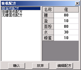 实 例:!RecipeModifyByDialog(” 面包配方组 “)