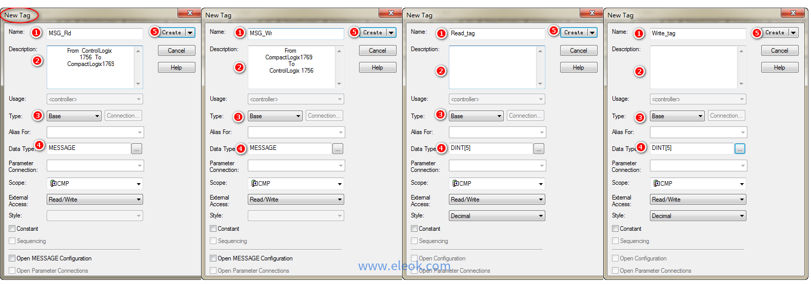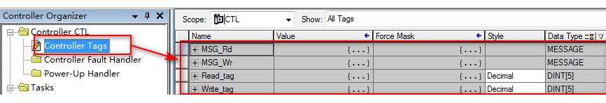 (3) Read_tag,数据类型DINT[5],存储从1756-L72读取的数据;