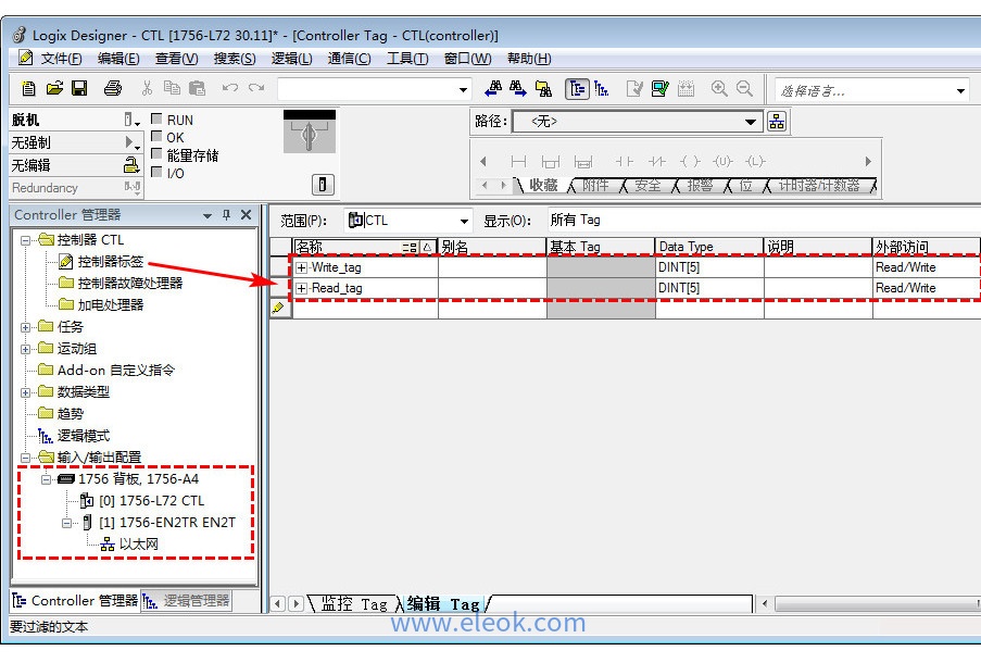 3. 再次打开Studio 5000软件,新建项目名称为“CTL”,控制器选择1756-L72,添加以太网通信模块1756-EN2TR,命名为EN2T, 并在控制器标签里面创建2个标签,Write_tag,Read_tag,数据类型均为DINT[5],将程序下载到控制器并在线.