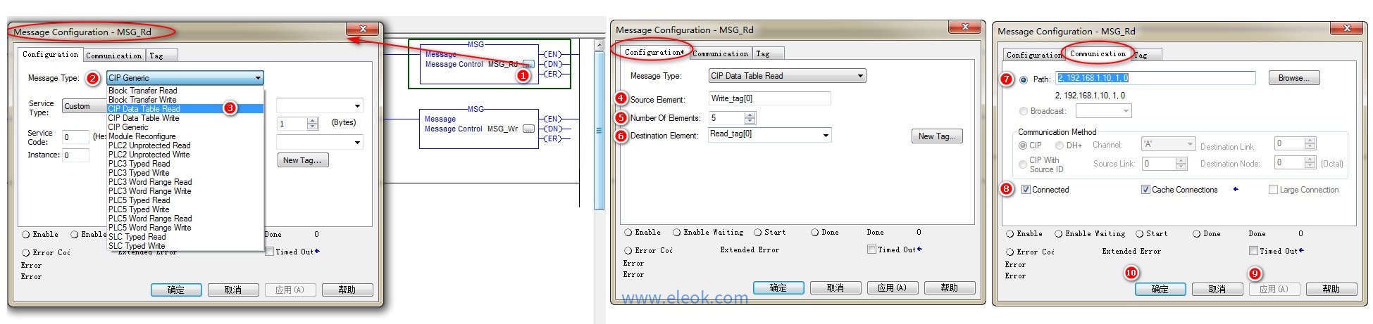 5. 在项目CMP(1769-L33ERM)里面调用MSG指令,编写读取、发送数据的程序,详见下图.
