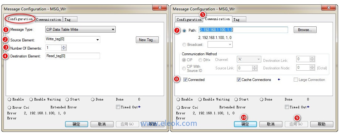 4. 指令MSG_Wr用来发送数据到1769-L33ERM,其中Message Type等参数与CMP程序配置相同,请参考前面表述,通信路径:EN2T,2,192.168.1.20,1,0(注意:符号为英文符号,前面也是).