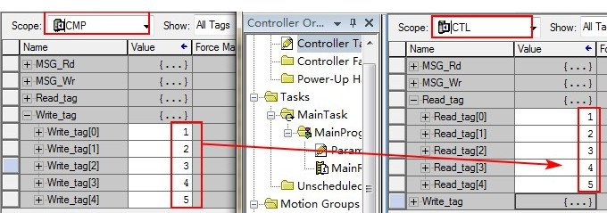 5. 功能测试,将项目CTL中的程序下载并在线,在CMP标签Write_tag写入数据,控制器CTL中的标签Read_tag数据立即发生变化与之相同;在CTL标签Write_tag写入数据,控制器CMP中的标签Read_tag数据立即发生变化与之相同,说明通信成功.
