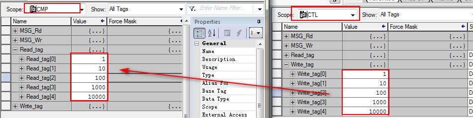 8. 功能测试,将项目CMP中的程序下载并在线,在CMP标签Write_tag写入数据,控制器CTL中的标签Read_tag数据立即发生变化与之相同;在CTL标签Write_tag写入数据,控制器CMP中的标签Read_tag数据立即发生变化与之相同,说明通信成功.